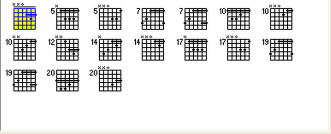 I numeri riportati negli schemi indicano il tasto su cui posizionare l'indice della mano sinistra o il barrè. Gli schemi che non riportano alcun numero rappresentano un accordo in prima posizione.