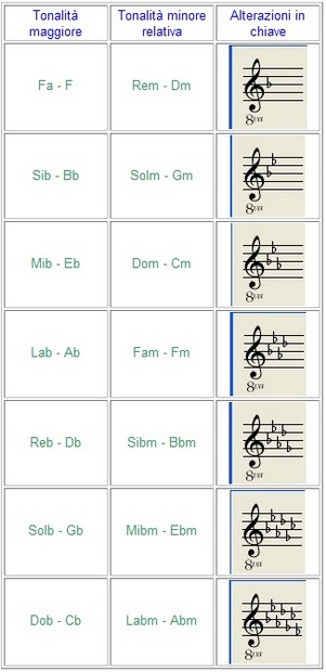 Nelle tonalità in bemolle l'ordine di aggiunta dei bemolli in chiave è il seguente: Si - Mi - La - Re - Sol - Do - Fa.