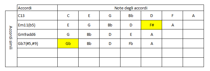Le note evidenziate in giallo sono quelle da omettere per ottenere accordi simili.